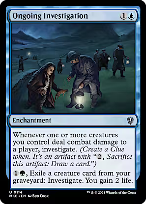 Whenever one or more creatures you control deal combat damage to a player, investigate. (Put a colorless Clue artifact token onto the battlefield with "{2}, Sacrifice this artifact: Draw a card.")